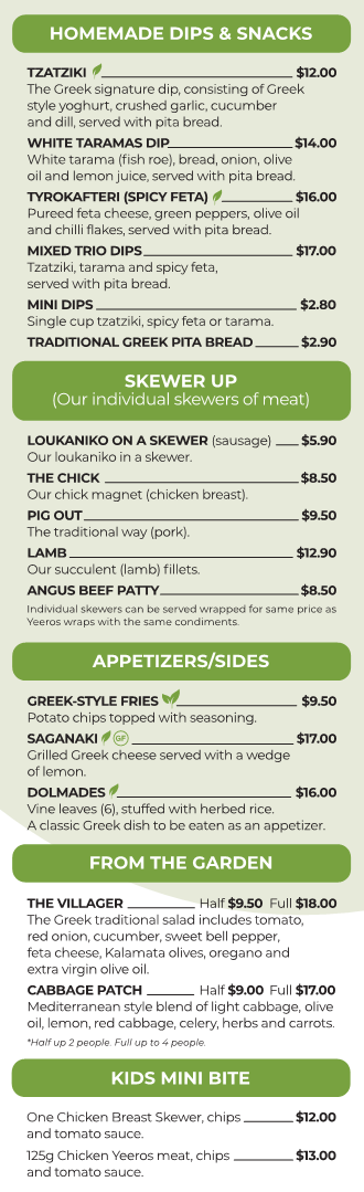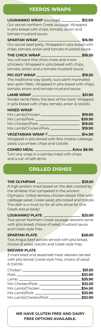 incorporating all of our three different types of yeeros meats (chicken, lamb, pork) served with pita bread, Greek-style fries, Greek salad, cabbage salad and tzatziki, to compliment your meat.